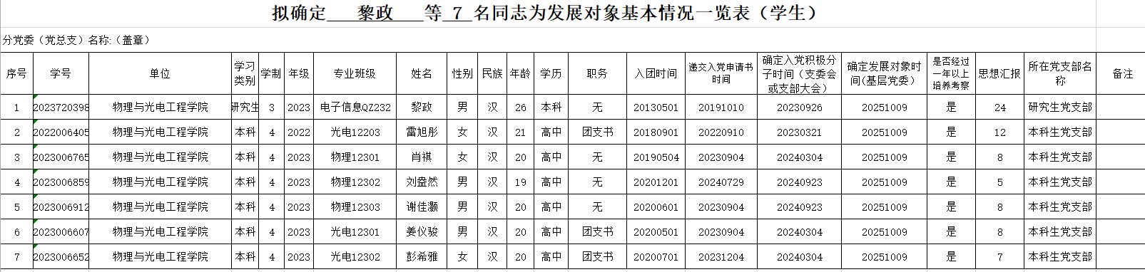 关于确定 黎政 等 7 名同志为发展对象的公示