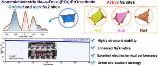 研究团队提出了一种可拓展的合成策略,通过的铁价态来实现对NFPP材料的局域结构调控。非化学计量比的Na4.024Fe2.921(PO4)2P2O7产物以惰性Na⁺有序性与比例之间的最佳平衡实现结构稳定性与传输速率的双重保障。这些有序的Na⁺作为坚固的结构支柱,相较于无序产物显著增强了稳定性;且经过优化的钠环境,进一步协同提升了材料的热稳定性与离子动力学性能。基于上述结构优势,该材料表现出卓越的电化学性能:经历10,000次循环后,容量保持率仍高达90.7%;同时,脱钠过程中仅4.18%的微小晶格体积变化,进一步从结构层面证实了其优异的稳定性。此外,以千克级Na4.024Fe2.921(PO4)2P2O7正极与硬碳负极组装的圆柱形全电池在-40~45°C的宽温度范围内均展现出优异的性能。该研究揭示了局部环境与电化学性能之间的关键相互作用,为先进正极材料的设计提供了重要见解。