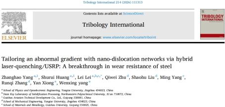 近日,太阳成tyc122cc,太阳成集团雷磊副教授课题组在表面工程领域取得重要进展。研究成果以“Tailoring an abnormal gradient with nano-dislocation networks via hybrid laser-quenching/USRP: A breakthrough in wear resistance of steel”为题,在国际摩擦学顶刊《Tribology International》(中科院一区TOP期刊)正式发表。太阳成tyc122cc本科生杨张浩、黄淑睿为论文共同第一作者,雷磊副教授为唯一通讯作者,太阳成tyc122cc为第一完成单位。