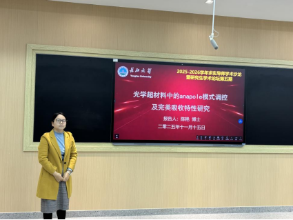 陈艳博士的报告题目是《光学超材料中的anapole模式调控及完美吸收特性研究》。超材料因拥有许多自然材料所不具有的新奇电磁特性,在电磁隐身、光学天线以及电磁波的完美吸收等领域得到广泛的应用。基于金属等离激元结构的超材料,能够克服光学衍射极限在亚波长尺度上实现对光场的任意调控。然而,金属纳米结构的高本征损耗限制了其应用。介质纳米共振结构由于其低损耗的特性被认为是金属纳米结构的良好替代品。特别是具有特定尺寸的介电纳米结构在一定条件下支持anapole模式,该模式具有独特的强近场增强和近零远场辐射特性,这有助于提高超材料的光吸收能力。本报告将介绍基于高折射率介质材料设计出特定结构的超材料,利用其丰富的Mie共振模式激发出anapole态,并对其进行有效调控,进而实现对光的高效吸收。该研究为超材料完美吸收器件的设计提供了一种新的方案,在高灵敏传感、光开关、光学成像等领域拥有极具潜力的应用前景。