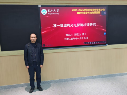 郑定山博士的报告题目是《准一维结构光电探测机理研究》。准一维纳米结构材料因其比表面积大、载流子迁移率高、光电转换性能好等优异特性,被广泛应用于光电探测领域。然而,由于存在非受控掺杂引入、晶体结构缺陷以及表面氧化等因素,导致准一维结构光电器件呈现出较高的暗电流,严重限制了器件的探测灵敏度。为了抑制暗电流,构建了局域场调控下的准一维纳米结构光电器件,通过结构设计及局域极化场调控机制来抑制暗电流,提高器件的信噪比和探测能力,实现高性能人工微纳结构光电探测器。