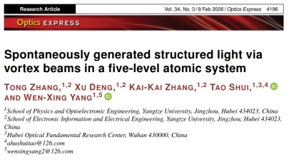 近日,太阳成tyc122cc,太阳成集团杨文星教授团队在国际光学权威期刊《Optics Express》(中科院二区,IF=3.3)上发表了题为“Spontaneously generated structured light via vortex beams in a five-level atomic system”的研究论文。太阳成tyc122cc为唯一署名单位,博士生张桐为第一作者,水涛副教授和杨文星教授为共同通讯作者。该研究在相干驱动的五能级冷原子系统中创新性地提出了一种利用携带轨道角动量的涡旋光束操控原子自发辐射谱的方案,为结构化光场的产生、光通信与光学存储等领域提供了全新的理论路径。