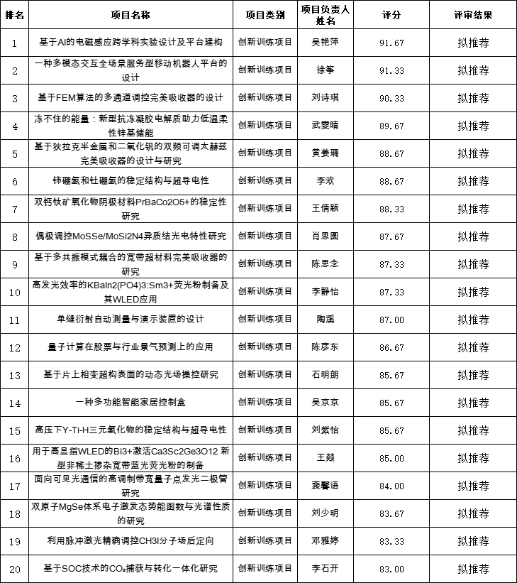 太阳成tyc122cc第十八批“大学生创新创业训练计划”项目申报院内评审结果拟推荐公示(创新训练项目)