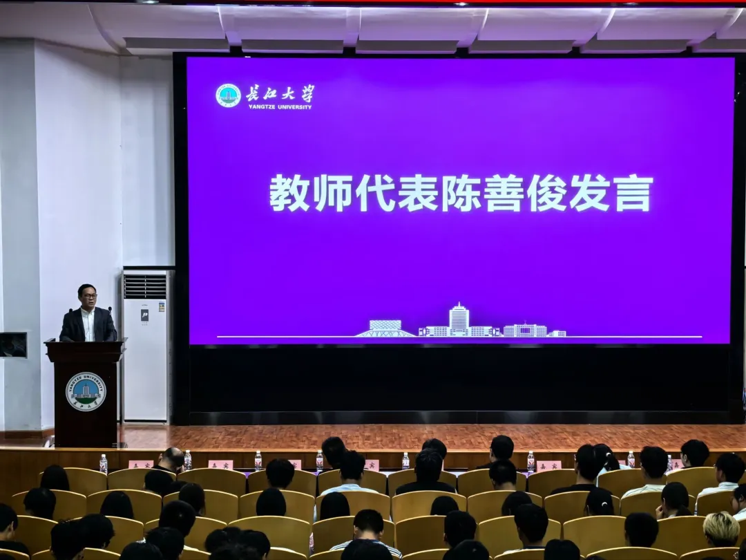 教师代表陈善俊指出大学是人生重要转折点,既是知识殿堂,更是塑造人格、锤炼能力、实现梦想的摇篮,希望新同学主动参与课堂互动、投身科研实践以激发潜能、提升自我同时在专业领域持续精进,收获成长与荣光。