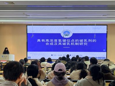 化学与环境工程学院李周城同学汇报了高浓度氢键位点破乳剂的合成及相关研究,为工业污水处理领域的技术优化提供了新的研究思路;刘俊龙同学分享了泡沫镍基硫化物电催化剂的制备与性能研究情况,呈现了能源材料相关方向的阶段性研究成果。