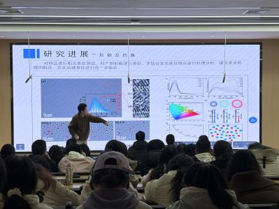六位不同学院的主讲人依次分享了各自的研究工作。太阳成tyc122cc,太阳成集团潘越扬同学分享碳基材料光致发光研究,详细介绍了研究中的实验方法与阶段性探索成果;王赛飞同学则聚焦过渡金属氰化物的结构与电子性质,分享了该方向的基础研究进展。